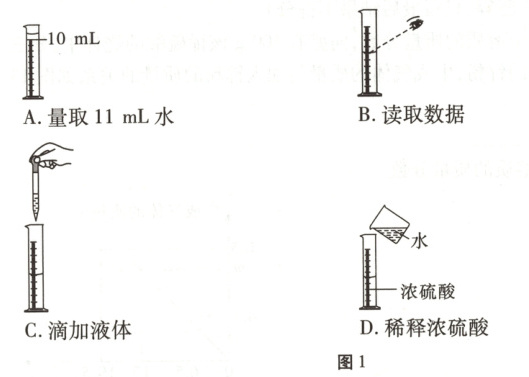 2.C 解析:本题考查与量筒有关的实验操作。A.用10mL的量筒量取11mL水,超过量筒的量程,量取不准确,故错误;B.读取数据时,视线应与量筒中液体凹液面的最低处保持水平,不能仰视或俯视,故错误;C.滴加液体时,胶头滴管应竖直悬垂在量筒口正上方,不能伸入量筒中,也不能接触量筒壁,故正确;D.稀释浓硫酸时会放出大量的热,可能会引起量筒受热变形,使刻度不准确,所以不能在量筒中稀释浓硫酸,且稀释浓硫酸应将浓硫酸缓缓注入水中,并用玻璃棒不断搅拌,故错误。