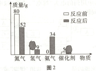 6. 当前,氨气(NH₃)的能源化应用逐渐成为研究热点。工业上常用氮气和氢气合成氨气,一定条件下,在密闭容器中加入反应物和催化剂进行该反应,反应前后各物质的质量如图2所示,图中有两处被墨迹遮盖。下列说法正确的是(