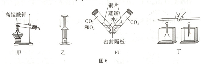 C.丙:左侧铜片生锈,右侧铜片不生锈,说明铜生锈的条件之一是与O₂接触