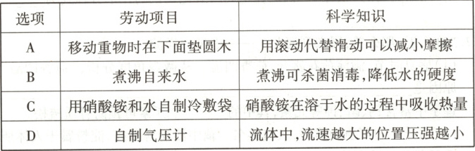 13.D 解析:本题考查劳动项目中包含的科学知识。A.移动重物时在下面垫圆木,是因为用滚动代替滑动可以减小摩擦,故正确,不符合题意;B.将自来水煮沸可杀菌消毒,降低水的硬度,故正确,不符合题意;C.用硝酸铵和水自制冷敷袋,是因为硝酸铵在溶于水的过程中吸收热量,故正确,不符合题意;D.自制气压计是利用了大气压,故错误,符合题意。