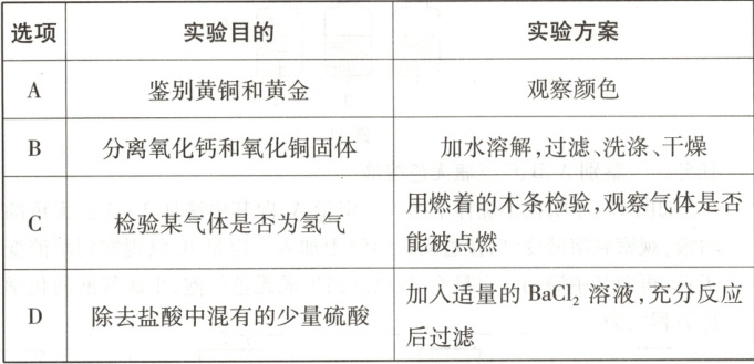 9.D 解析:A.黄铜(铜锌合金)和黄金颜色相近,仅靠观察颜色难以鉴别,故错误;B.加水溶解,氧化钙能与水反应生成氢氧化钙,氧化铜不溶于水,过滤、洗涤、干燥得到的是氧化铜,无法得到氧化钙,故错误;C.可燃气体不一定是氢气,也可能是甲烷、一氧化碳等,故错误;D.加入适量的BaCl₂溶液,氯化钡与硫酸反应生成硫酸钡沉淀和盐酸,充分反应后过滤,可以除去盐酸中混有的少量硫酸,符合除杂原则,故正确。