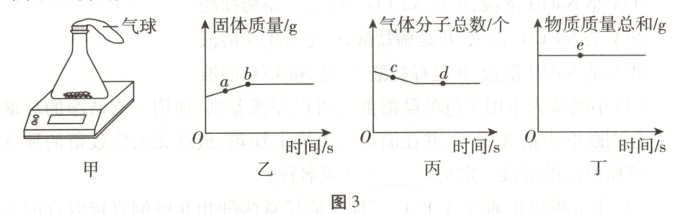 10. (2025·重庆)用天平称量铜粉在密闭容器中加热前后的质量(如图3甲所示)来验证质量守恒定律。在同一实验中,相同时间内,容器内各种物理量随时间变化的关系如图3乙至丁所示(e点为图丁图像上任意点)。下列说法不正确的是 (