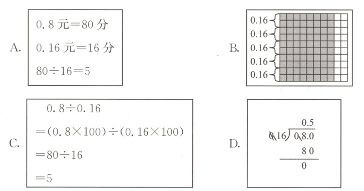 5. 下面是四名同学计算“$0.8÷0.16$”的方法,计算方法不正确的是(