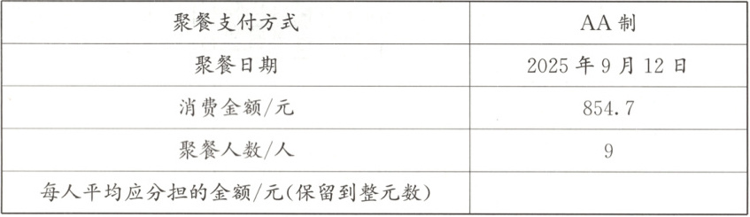 AA 制是指每人平均分担所需的费用。下面是玲玲妈妈和公司同事聚餐的具体消费情况,请将表格填写完整。