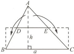 3. 我国古代数学家刘徽利用出入相补原理来计算平面图形的面积。如右图所示,三角形 ABC 的底为 a ,高为 h ( D 、 E 分别为 AB 、 AC 边上的中点)。转化后的长方形的长是(),宽是(),所以三角形 ABC 的面积 S = ( )。