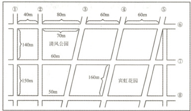 4. 如下图所示,小明家附近有一个宾虹花园和一个清风公园。道路③④⑤互相平行,道路①②互相平行,道路⑥⑦⑧和道路①②互相垂直。宾虹花园和清风公园相比,哪个公园的面积更大?