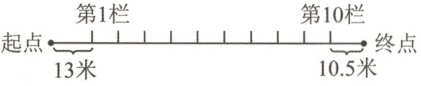 9. 国际田径联合会规定:女子 100 米栏的首个栏架与起点的距离为 13 米,最后一个栏架与终点的距离为 10.5 米。第 1 栏至第 10 栏,每相邻两栏之间的距离都是相等的。每相邻两栏之间的距离是多少米?