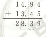 4. 新考向算法理解(贵阳市南明区)明明去书店买了一本作文书花了 14.94 元,又买了一本科幻书花了 13.45 元。一共花了多少元?列竖式计算,右面虚线框中的“9”加“4”表示(
