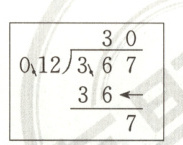 5. 新考向算法理解(毕节市七星关区)一条丝带长 3.67 米,每 0.12 米剪成一段,可以剪成多少段? 还剩下多少米? 右面竖式中箭头所指的“36”和余数“7”表示的意义分别是(