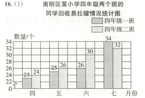 16. 新育人环保意识(贵阳市南明区·仿练)垃圾分类有很多优点,其中有一点是“变废为宝”,产生的垃圾中有 30%~40%可以回收利用。下面是南明区某小学四年级两个班的同学回收易拉罐情况统计表和统计图。(10 分)