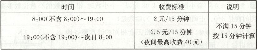 14. 疑难点(贵阳市云岩区)下面是某停车场的收费标准,王叔叔在 16:00 开车进人该停车场,21:25 驾车离开该停车场,王叔叔应交多少元停车费?(8 分)