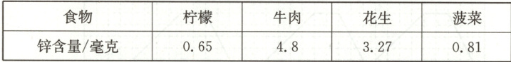 7. (生命健康·毕节市大方县·仿练)锌是人体必需的微量元素,可以促进儿童生长和智力发育。下面是几种常见食物 100 克中锌的含量表(1 克 = 1000 毫克)。