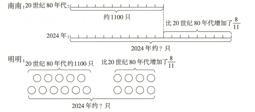 7. 新育人保护动物(贵阳市南明区·改编)国家林草局在 2024 年首场新闻发布会上介绍,我国大熊猫栖息地受保护面积从 139 万公顷增长至 258 万公顷,大熊猫野外种群总量比 20 世纪 80 年代(约 1100 只)增加了 $ \frac{8}{11} $,2024 年统计时大熊猫野外种群总量约有多少只? 下面两位同学运用画图的方法表示题目的意思,其中正确的是(