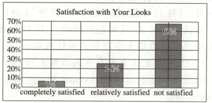 Attitudes towards whether we are satisfied with our looks vary from person to person. Only 7 per cent of students express being completely satisfied,while 26 per cent report being relatively satisfied. However,a significant 67 per cent admit not being satisfied with their looks.