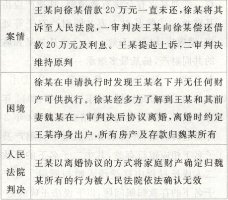 )①王某向徐某所借的20万元属于离婚前夫妻共同债务 ②王某和魏某离婚是以合法形式掩盖非法目的 ③王某和前妻魏某离婚系双方真实意思表示 ④夫妻之间的财产约定都不得对抗债权人