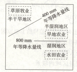 (注:图中有年等降水量线,400mm年等降水量线和800mm年等降水量线;标注了草原牧业(半干旱地区)、旱地农业(半湿润地区)、水田农业(湿润地区))