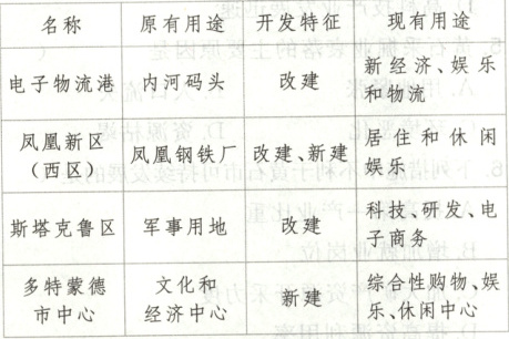 多特蒙德是鲁尔区第三大城市,20世纪50年代开始,多特蒙德的煤炭和钢铁两大支柱产业相继陷入危机,为应对经济衰退,多特蒙德采取积极措施促进当地的产业发展。为满足城市经济转型带来的对城市空间功能的新的需求,多特蒙德在土地利用布局上以更新、改造为主,已开发和正在开发的地区主要包括市中心等多片区域。下表示意多特蒙德(部分区域)空间功能变化。据此回答3~4题。