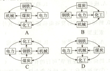 2.B 煤炭可以作为化工、电力、钢铁工业的原料(或能源),但它并不是机械工业的原料或能源;钢铁不是化工的主要原料。故选B。