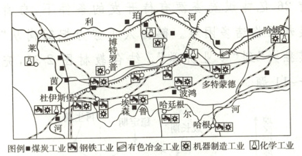 1.A 根据所学知识可知,鲁尔区作为传统工业区的典型代表,其支柱产业是煤炭工业和钢铁工业,它们能够发展起来是因为鲁尔区有丰富的煤炭资源和国内外巨大的市场需求,A正确;鲁尔区铁矿缺乏,需要进口,B错误;交通便利,水源充足不是最主要的原因,C错误;传统工业对技术要求不高,技术也不是主导因素,D错误。故选A。