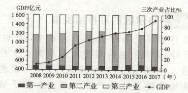 (2025·秦皇岛高二统考)湖北黄石有3 000年的矿冶史,地下蕴藏78种金属、非金属矿产资源,有“青铜古都”“钢铁摇篮”“水泥故乡”之称。黄石市2008年被定为资源枯竭转型试点城市,2015年年底关闭第一批露天矿山,采掘业产值明显下降。下图为2008—2017年黄石市GDP和三次产业结构统计图。读图,完成4~6题。