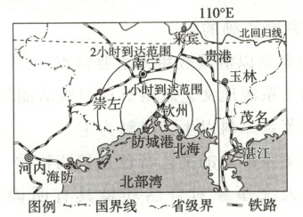 (注:图中有国界线、省级界、铁路,标注了城市(崇左、南宁、贵港、玉林、茂名、湛江、防城港、北海),还有2小时到达范围(以南宁为中心)和1小时到达范围(以钦州为中心),北部湾、河内、海防、南海等地理事物)