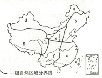 (注:图中标注了七个一级自然区,用字母a、b、c、d、e、f、g表示,还有一级自然区域分界线,右下角有南海诸岛缩略图)