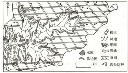 黄土高原水土流失治理的早期,造林需要有工程措施改善自然条件,提供适生环境。该地某小流域有宽广而平坦的塬面,经过多年的水土流失治理,塬面条田连片,沟坡林草茂密,沟底坝库相连。下图为“该小流域塬面附近综合治理示意图”。据此完成1~3题。