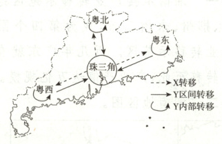 6.D 根据材料可知,双转移是广东省创造性地提出的对劳动力转移和产业转移的统称。劳动力转移一般是从经济落后地区转移到经济发达地区,产业转移一般是从经济发达地区转移到经济落后地区。图中珠三角地区相比粤北、粤东、粤西地区经济发达,则劳动力转移应该是Y区间转移,产业转移应该是X转移,而Y内部转移应该是指本地区产业向第二、三产业转移或第二产业向第三产业转移。X产业转移加速可促进Y内部转移。故选D。