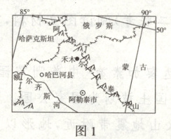 (注:图1中有经线85°、90°,纬线50°,标注了俄罗斯、蒙古、哈萨克斯坦、新疆、阿勒泰市、齐巴河县、禾木等地理事物,还有阿尔泰山)