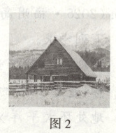 (注:图2为冬季木屋景观,屋顶为“人”字形,周围有积雪和栅栏)