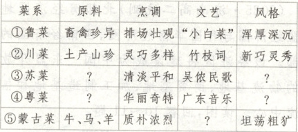 1.D 表中②川菜以麻辣浓重为主要特点,A错误;③苏 菜盛行于长江中下游平原地区,地势低平、河湖众多, 物产丰富,原料并不以生猛海鲜为主,C错误;④粤菜 源地广东省的文艺风格呈现活泼、节奏明快的特点,B 错误;⑤蒙古菜源地为内蒙古,文艺特色是长调牧歌, D正确。 2.D 梯田的修建说明该地坡度较缓,水电站的修建意味 着该地河流流量大、落差大、水能丰富,①④正确;戏曲 的发展主要反映的是社会风俗,不同菜系体现出不同的饮 食文化,两者对自然环境的指示性不如梯田和水电站明 确,②③错误。 故选D。