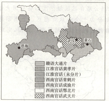 (注:图中标注了不同的方言区,包括赣语大通片、江淮官话黄孝片、江淮官话(未分片)、西南官话常鹤片、西南官话成渝片、西南官话鄂北片、西南官话武天片,还有城市武汉、黄石、恩施)