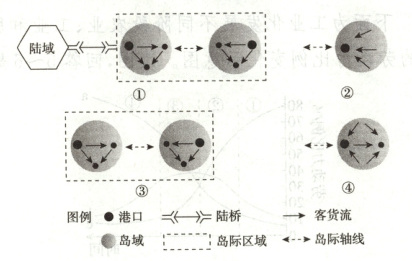 (2025·连云港高二统考)港口地域组合是指一定地域范围内的诸多港口长期相互作用,形成具有某种分布格局、结构形式和功能类型的组合。下图示意海岛港口地域组合演变的不同阶段。据此完成1~2题。