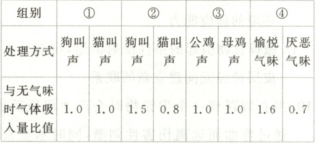 7. 研究显示气味会导致鼻孔气体吸入量变化,但与声音无关。研究显示在睡眠过程中,多次给予诸如狗叫声—愉悦气味或猫叫声—厌恶气味强化后,所形成的条件反射即使在醒来后依然存在。下表组合中最能证明声音和气体吸入量间建立了条件反射的是(