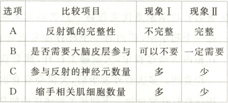 6. 现象Ⅰ:小明的手指不小心碰到一个很烫的物品而将手缩回;现象Ⅱ:小明伸手拿别人的物品被口头拒绝而将手缩回。两个现象中的缩手反应比较见下表,正确的是(