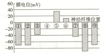 6. 如图表示受刺激后,某时刻神经纤维上①~⑨连续9个位置的膜电位,已知静息电位为-70mV。下列叙述错误的是(