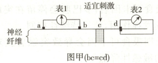 8. 如图甲所示,在神经纤维上安装两个完全相同的灵敏电表。表1两电极分别在a、b处膜外,表2两电极分别在d处膜的内外侧,在bd中点c处给予适宜刺激,相关的电位变化曲线如图乙、图丙所示。下列分析中,错误的是(