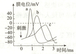 B.由图中三条曲线a、b、c可知,细胞外液中Na⁺浓度高低的关系是a>b>c