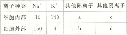 9. 已知神经细胞膜、肌肉细胞膜两侧离子的分布不平衡。如表表示的是哺乳动物肌肉细胞在静息状态下,细胞内外离子浓度大小(单位:mmol/L)