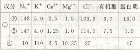 2. 如表所示为人体细胞外液和细胞内液的物质组成和各物质含量(单位为mmol·L⁻¹)的测定数据,②③中的许多物质可以相互交换。下列相关叙述不正确的是(