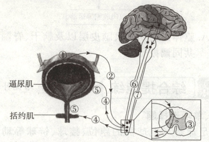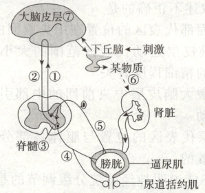 (2)大脑皮层产生尿意,在大脑的支配下,尿经尿道排出体外,某人由于脊髓某个部位意外受伤而导致能产生尿意但不能控制排尿,则该患者的受伤部位可能是图中的⑦(下行的神经纤维)。此时,排尿反射的神经中枢位于题图中的③(脊髓)。