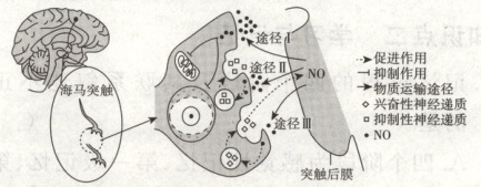 NO还可通过途径Ⅱ促进突触前膜的突触小泡释放抑制性神经递质,阻断突触前膜和突触后膜的兴奋传递,使学习和记忆能力下降