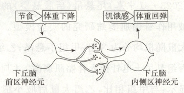 10. (2023·河北卷改编)节食可减轻体重,但容易发生回弹。如图所示,下丘脑前区神经元在体重下降时兴奋,释放神经递质谷氨酸,使下丘脑内侧区神经元兴奋,增加饥饿感。下列叙述正确的是(