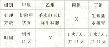9. 欲研究甲状腺和甲状腺激素的生理作用,对成年小鼠的分组及处理见表。在适宜的实验条件下,正常饲养,每隔一定时间测定耗氧量(单位时间内单位体重的氧消耗量),记录数据并统计分析。注:本实验中灌胃是指将液体由动物口直接注入胃中。