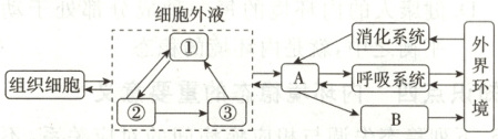 B.CO₂排出人体的途径为组织细胞→①→②→A→呼吸系统→外界环境