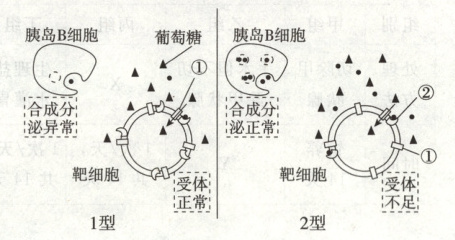 6.C 胰岛素的作用是能促进组织细胞摄取、利用和储存葡萄糖,A正确;①表示葡萄糖转运蛋白,其数量受胰岛素分泌量的影响,B正确;2型糖尿病是由于靶细胞膜上的胰岛素受体不足,C错误;由于胰岛B细胞合成分泌胰岛素异常,而导致1型糖尿病,可通过注射胰岛素进行治疗,D正确。