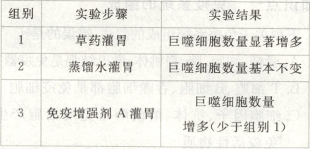 6.A 由表分析可知,该实验的自变量是灌胃所用液体的种类,包括某种草药、蒸馏水和免疫增强剂 A,A错误。