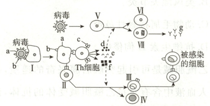 8. 如图是人体对某病毒的部分免疫过程示意图,Ⅰ~Ⅶ表示不同种类的细胞,Th细胞(辅助性T细胞)是T细胞的一种,a~g代表不同的物质。下列叙述错误的是(