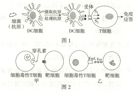 10. 科学家研究发现一种树突状细胞(DC细胞),在免疫反应中有强大的摄取、处理和呈递抗原的功能,下图1为DC细胞参与免疫的过程。细胞免疫应答结束时,细胞毒性T细胞杀伤靶细胞主要有两条途径,一条是细胞毒性T细胞分泌穿孔素(成孔蛋白)在靶细胞膜上形成多聚穿孔素管状通道来损伤靶细胞膜,如图2甲所示;另一条是细胞毒性T细胞通过表面FasL(死亡因子)与靶细胞表面的Fas(死亡因子受体)结合,诱导靶细胞凋亡,如图2乙所示。回答下列问题: