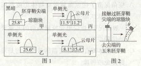 6.C 由题图2可知,琼脂块中生长素含量越多,胚芽鞘弯曲角度θ越大,故胚芽鞘的弯曲角度θ可反映琼脂块中生长素的含量,A正确;对比图1中甲、乙两图琼脂块中的数字可知,单侧光不影响生长素从胚芽鞘尖端向琼脂块的扩散,B正确;分析图1中丙图琼脂块中的数字可知,单侧光没有诱导向光侧胚芽鞘中的生长素发生分解,C错误;对比图1中丙、丁两图琼脂块中的数字可知,单侧光可以引起胚芽鞘中的生长素向背光侧转移,D正确。